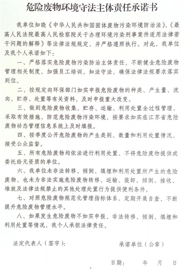 按照江蘇省環(huán)保廳的要求,每個危險廢物產(chǎn)生單位和經(jīng)營單位都要簽署“危險廢物環(huán)境守法主體責任承諾書”,一式二份,一份交屬地環(huán)保局,一份自留。
