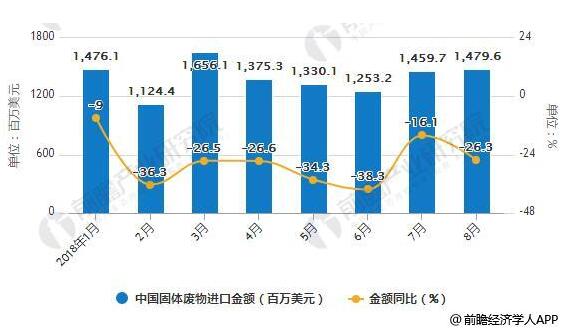 在進口金額方面,2018年3-6月中國固體廢物進口金額呈下降趨勢,2018年6月中國固體廢物進口金額為1253百萬美元,同比下降38.3%。2018年7-8月中國固體廢物進口金額有所回升,2018年8月中國固體廢物進口金額為1480百萬美元,同比下降26.3%。