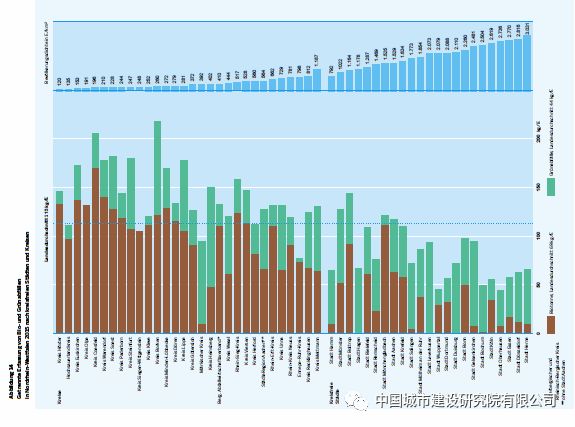 德國不同地區(qū)人均單獨(dú)收集的有機(jī)垃圾量差別很大。這是德國北威州2015年的有機(jī)垃圾人均分類收集量統(tǒng)計(jì)。最右邊的人口密度高的地區(qū)是所謂的城市,城市人口密度最高也就是每平方千米2000多人,比我們低多了,因此,單獨(dú)收集的有機(jī)垃圾主要是園林垃圾(綠色部分),而廚余垃圾收集量較少(紅色部分),而相應(yīng)的農(nóng)村地區(qū),單獨(dú)收集的有機(jī)垃圾主要是廚余垃圾,園林垃圾占比反而低。實(shí)際上,德國農(nóng)村以及小城鎮(zhèn)地區(qū),園林綠化面積更多,相應(yīng)園林垃圾產(chǎn)生量會更多,但是這部分園林垃圾并沒有納入統(tǒng)計(jì),這也反映了生活垃圾統(tǒng)計(jì)口徑問題。德國廚余垃圾分類收集的實(shí)際數(shù)據(jù)對國內(nèi)開展垃圾分類有很好的借鑒意義。