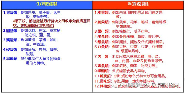 臺北市自2003年12月26日開始全面回收家庭廚余,家庭廚余分類為“養(yǎng)豬廚馀”及“堆肥廚馀”,詳細(xì)分類如上表所示。