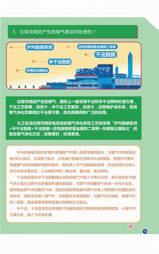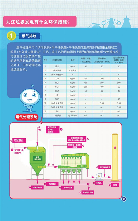 據(jù)介紹,九江垃圾焚燒發(fā)電項(xiàng)目煙氣凈化工藝采用“SNCR脫硝+半干法脫酸+干法脫酸+活性炭吸附+布袋除塵+煙氣再循環(huán)”的組合工藝技術(shù),達(dá)到并優(yōu)于歐盟2010標(biāo)準(zhǔn)。滲濾液和其他廢水處理達(dá)標(biāo)后全部廠內(nèi)回用。年供綠色電能3億度,節(jié)約標(biāo)準(zhǔn)煤12萬(wàn)噸/年,二氧化碳減排2.5萬(wàn)噸/年,COD減排1.5萬(wàn)噸/年。