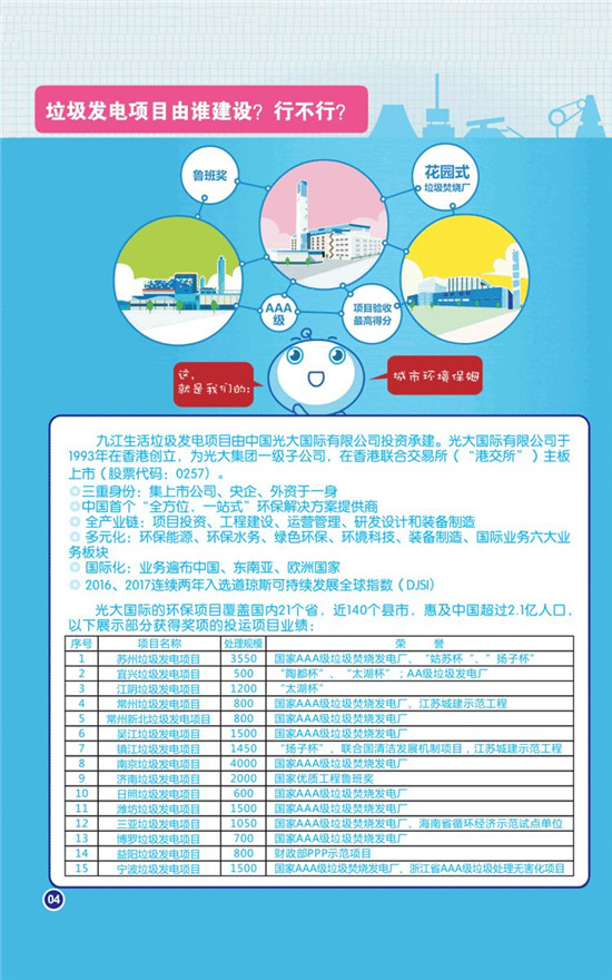 同杭州九峰垃圾焚燒發(fā)電項(xiàng)目一樣,九江垃圾焚燒發(fā)電項(xiàng)目也將由中國(guó)光大國(guó)際有限公司投資、建設(shè)、運(yùn)營(yíng)。據(jù)了解,光大國(guó)際在全國(guó)各地先后投資、建設(shè)、運(yùn)營(yíng)99個(gè)項(xiàng)目,日處理生活垃圾規(guī)模超過(guò)8萬(wàn)噸,成為國(guó)內(nèi)垃圾焚燒發(fā)電行業(yè)領(lǐng)頭羊。光大國(guó)際所投資建設(shè)的垃圾發(fā)電項(xiàng)目均采用機(jī)械爐排爐工藝,煙氣排放執(zhí)行最為嚴(yán)格的歐盟2010標(biāo)準(zhǔn),煙氣監(jiān)測(cè)系統(tǒng)與當(dāng)?shù)丨h(huán)保部門(mén)在線聯(lián)網(wǎng),各種排放指標(biāo)向社會(huì)及時(shí)公布。垃圾滲濾液的綜合處理開(kāi)創(chuàng)了國(guó)內(nèi)“先河”,以一個(gè)個(gè)環(huán)境優(yōu)美的花園式垃圾焚燒發(fā)電項(xiàng)目,向社會(huì)、居民、各地政府鄭重兌現(xiàn)了承諾。