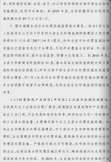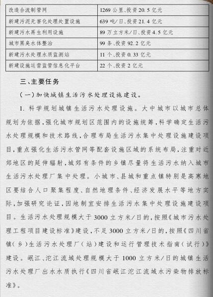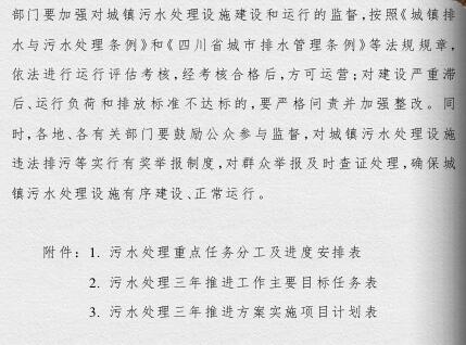 四川省政府印發(fā)了《四川省城鎮(zhèn)污水處理設(shè)施建設(shè)三年推進方案》?!斗桨浮诽岢觯衲瓿啥际薪ǔ蓞^(qū)要全部消除黑臭水體,到2019年,全省城鎮(zhèn)基本具備污水收集能力,地級及以上城市建成區(qū)黑臭水體比例控制在10%以內(nèi),全面實現(xiàn)城鎮(zhèn)污水處理設(shè)施運行規(guī)范化和監(jiān)管信息化,實現(xiàn)超標工業(yè)廢水零排放,70%的行政村生活污水得到有效處理。