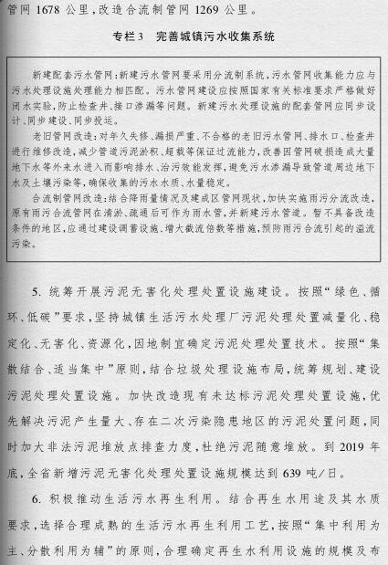 到2019年,全省城市和重點鎮(zhèn)實現(xiàn)污水處理設(shè)施建設(shè)全覆蓋,城鎮(zhèn)生活污水處理廠提標改造基本完成,新增城鎮(zhèn)生活污水管網(wǎng)7598公里,改造老舊污水管網(wǎng)1678公里、合流制管網(wǎng)1269公里,新增污泥無害化處理處置設(shè)施規(guī)模達639噸/日,新增再生水利用設(shè)施規(guī)模達89萬立方米/日。