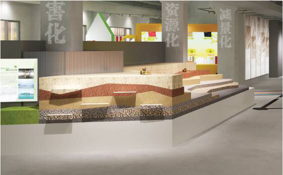 譬如,“焚燒處理流程”模型,含電動抓取機械裝置,垃圾焚燒數(shù)據(jù)與老港焚燒廠同步?!吧幚砹鞒獭蹦P?,內(nèi)藏LED燈帶,模擬濕垃圾處理流程。“衛(wèi)生填埋”沙盤,則仿地質(zhì)材料,直觀展示垃圾填埋操作工藝,包括滲瀝液如何收集與處理、填埋氣體如何利用等,模型背面設(shè)置可開啟的抽屜,展示可降解垃圾填埋若干年后的標(biāo)本。