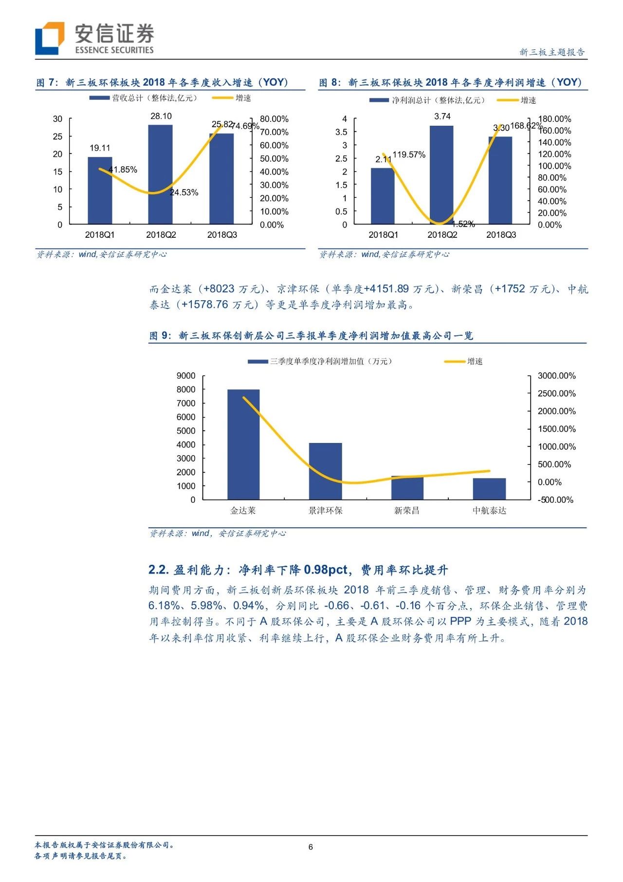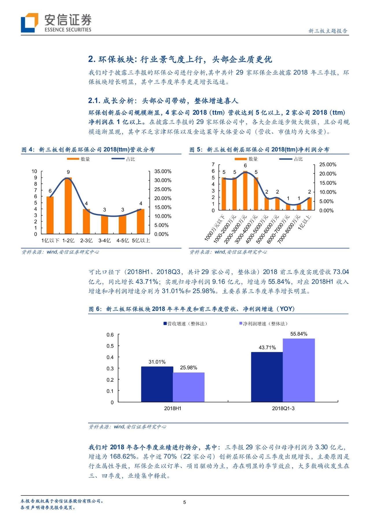 成長分析:可比口徑下,2018前三季度實現營收73.04億元(+43.71%);實現歸母凈利潤9.16億元(+55.84%),增速高于半年報。主要原因是環(huán)保創(chuàng)新層公司第三季度單季增長明顯(凈利潤增長168.62%)。且環(huán)保創(chuàng)新層公司多為各細分行業(yè)的龍頭,近70%環(huán)保公司實現增長,4家2018(ttm)凈利潤在5億元以上,規(guī)模逐漸顯現,其中不乏京津環(huán)保以及金達萊等大體量公司。