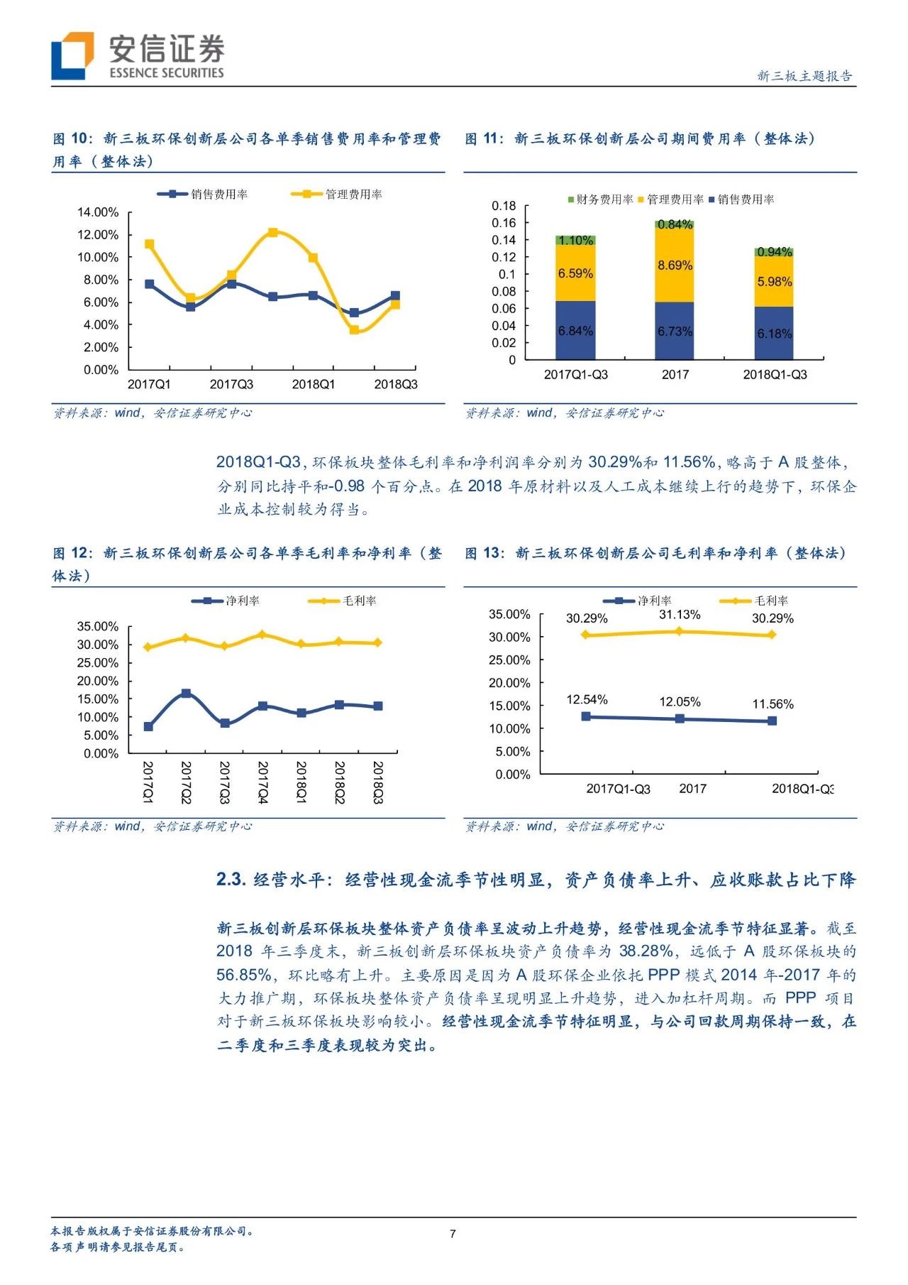 盈利能力:1)期間費用:新三板環(huán)保板塊2018年前三季度銷售、管理、財務費用率分別為6.18%、5.98%、0.94%,同比-0.66、-0.61、-0.16個百分點,銷售、管理費用率控制得當。財務費用率低于A股環(huán)保公司(A股為2%-3%),主要原因是因為A股以PPP為主要模式,2018年以來利率信用收緊、利率繼續(xù)上行。2)2018Q1-Q3,新三板環(huán)保板塊整體毛利率和凈利率為30.29%、11.56%,略高于A股整體,分別同比持平和-0.98個百分點。