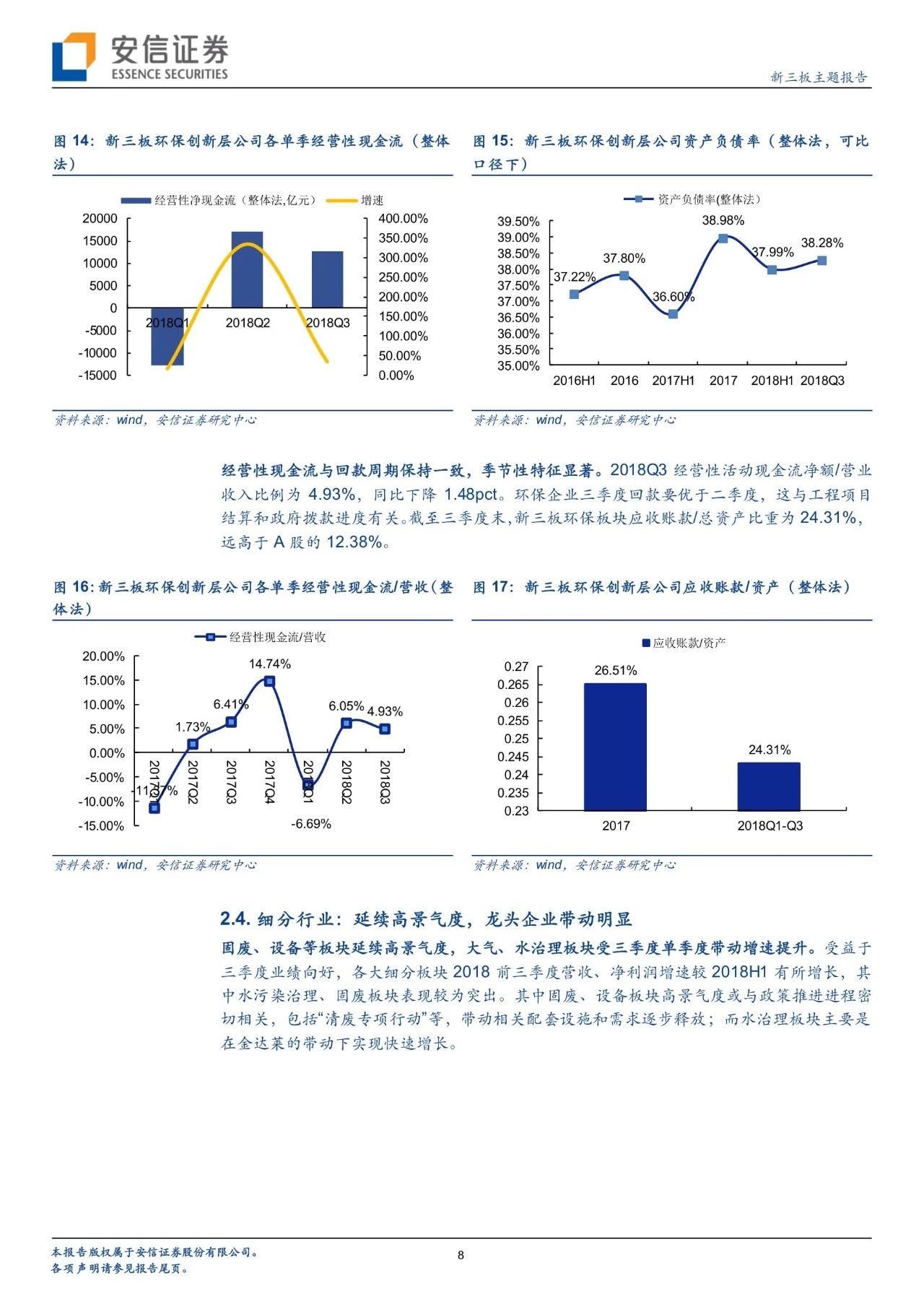 經營水平:截至2018年三季度末,新三板創(chuàng)新層環(huán)保板塊資產負債率為38.28%,遠低于A股環(huán)保板塊的56.85%,主要原因是A股環(huán)保企業(yè)依托PPP模式,且2014年-2017年的大力推廣期,資產負債率呈現明顯上升,進入加杠桿周期,而PPP項目對于新三板環(huán)保板塊影響較小。經營性現金流與回款周期保持一致,季節(jié)性特征顯著。2018Q3經營性活動現金流凈額/營業(yè)收入比例為4.93%,同比下降1.48pct。環(huán)保企業(yè)三季度回款要優(yōu)于二季度,這與工程項目結算和政府撥款進度有關。截至三季度末,新三板環(huán)保板塊應收賬款/總資產比重為24.31%,遠高于A股的12.38%,主要與新三板環(huán)保企業(yè)議價能力有關。
