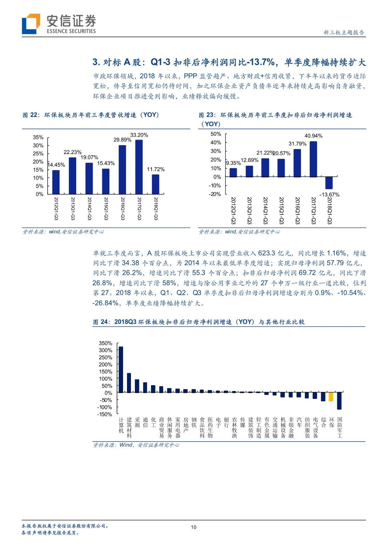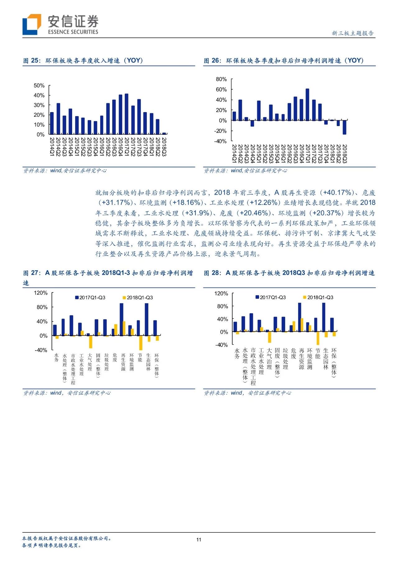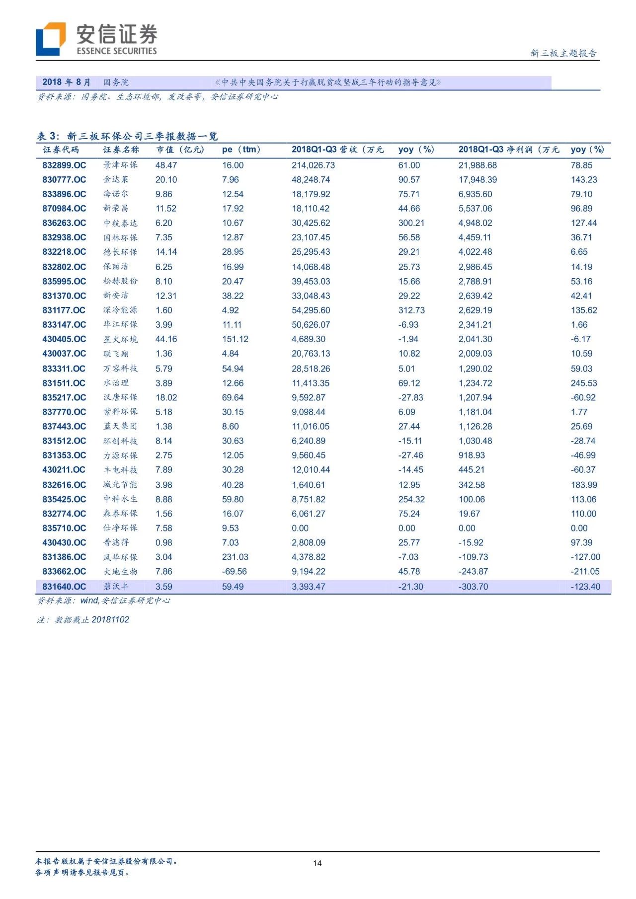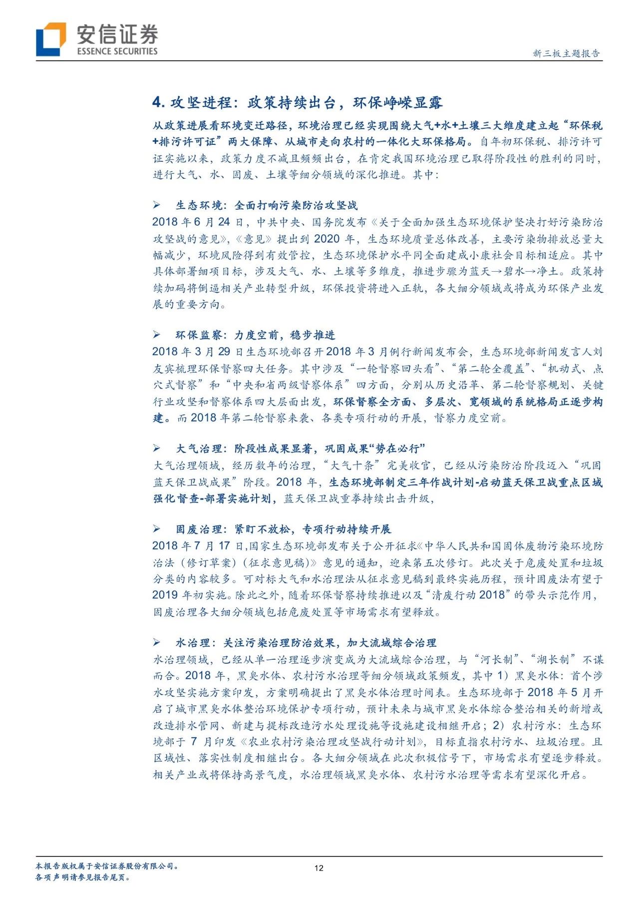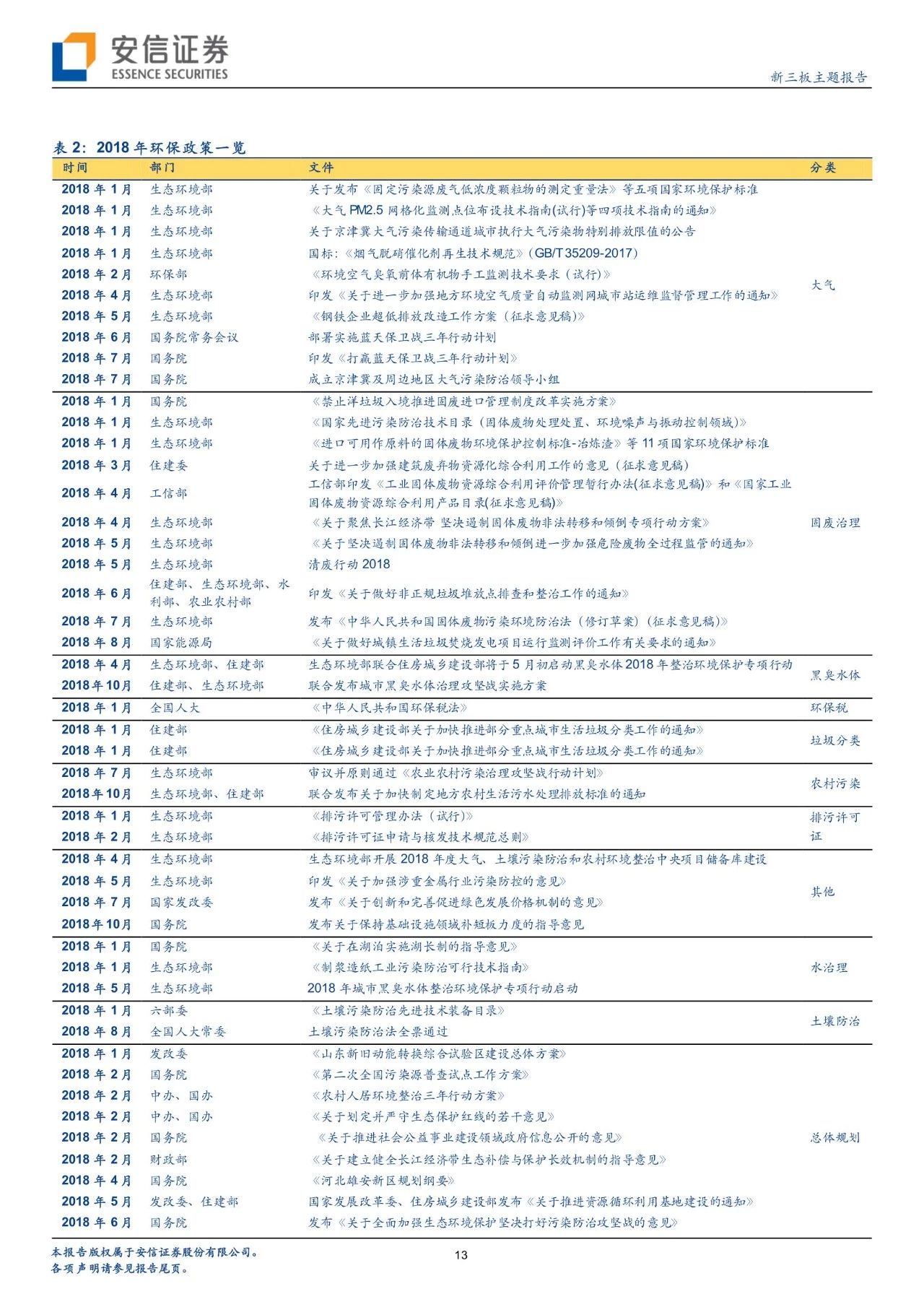 從政策進展看環(huán)境變遷路徑,環(huán)境治理已經實現圍繞大氣+水+土壤三大維度建立起“環(huán)保稅+排污許可證”兩大保障、從城市走向農村的一體化大環(huán)保格局。自年初環(huán)保稅、排污許可證實施以來,政策力度不減且頻頻出臺,在肯定我國環(huán)境治理已取得階段性的勝利的同時,進行大氣、水、固廢、土壤等細分領域的深化推進。我們對于2018年以來各細分板塊政策及變遷進行了梳理。而新三板擁有400家公司,覆蓋了大氣治理、水治理、固廢治理等各個領域。我們繼續(xù)看好環(huán)保板塊,建議從政策推進進程中發(fā)掘潛在機會,建議關注水治理、固廢治理和再生資源板塊投資機會。