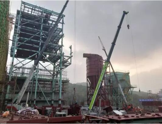 2、煙氣處理:收塵器室中箱體焊接,進(jìn)風(fēng)變徑管焊接;反應(yīng)塔直筒、蝸殼焊接,公共平臺(tái)安裝;消石灰主鋼構(gòu)拼裝、吊裝就位;
