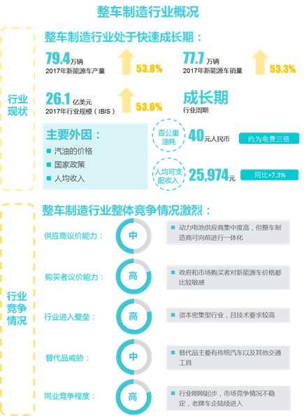 近幾年來我國新能源整車制造行業(yè)規(guī)模高速增長。根據(jù)中國汽車工業(yè)協(xié)會數(shù)據(jù),2017年中國新能源汽車產(chǎn)量為79.4萬輛,銷量為77.7萬輛,同比分別增長53.8%和53.3%,新能源汽車整車制造業(yè)近五年來一直保持高增速,汽車工業(yè)協(xié)會預(yù)計到2025年新能源車的市場占比將會達(dá)到15%。