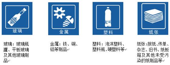 1.居住區(qū)域(居住小區(qū)、公寓區(qū)、別墅區(qū)等生活住宅區(qū)域):一般分為可回收物、廚余垃圾、有害垃圾、其他垃圾四類。