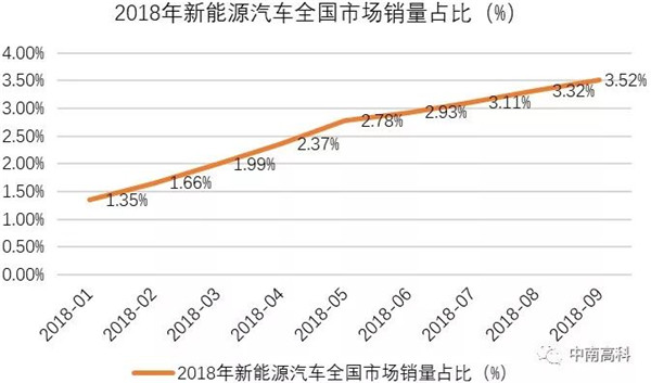 2018年1~9月(10月統(tǒng)計(jì)數(shù)據(jù)還未出),全國汽車?yán)塾?jì)銷量2049.06萬輛,累計(jì)同比增長1.49%;新能源汽車?yán)塾?jì)銷量72.1萬輛,同比增長81.1%。今年以來,全國汽車銷量同比增速除了1月份為11.59%,其余月份增速均在10%以下,且大部分月份同比增速低于5%;而新能源汽車月累計(jì)同比增速均在100%上下,遠(yuǎn)高于全國汽車?yán)塾?jì)同比增速,新能源汽車在全國市場的占比由年初的1.35%上升至9月份的3.52%,在市場的占比正在快速上升。新能源汽車越來越成為決定未來國內(nèi)整車生產(chǎn)企業(yè)競爭優(yōu)勢(shì)的關(guān)鍵著力點(diǎn),也正在面臨越來越多的新參與者加入。