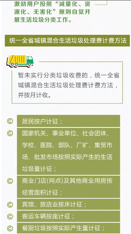 到2020年底前各市、縣(市、區(qū))要全面建立,覆蓋到所有建制鎮(zhèn)的生活垃圾處理收費(fèi)制度,按照《通知》,對非居民用戶和具備條件的居民用戶實(shí)行分類垃圾與混合垃圾差別化收費(fèi)政策,激勵(lì)用戶按照“減量化、資源化、無害化”原則,自覺開展生活垃圾分類工作,促進(jìn)垃圾源頭減量,推動可再生資源回收利用。