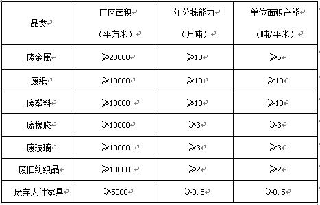 指分揀品類不少于二類,分揀能力和用地面積規(guī)劃設(shè)計(jì),應(yīng)以再生資源分揀用地標(biāo)準(zhǔn)和本區(qū)域再生資源實(shí)際產(chǎn)生量為準(zhǔn)??煞譃榇?、中、小型三個(gè)級(jí)別,各級(jí)別綜合型分揀中心的年分揀能力和廠區(qū)面積如下: