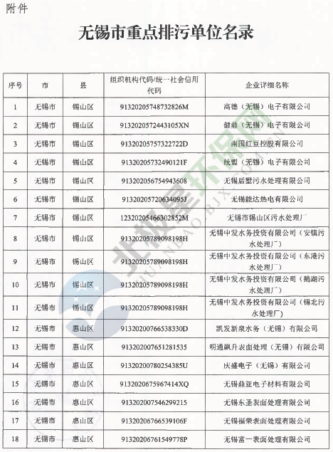 無錫市環(huán)境保護(hù)局發(fā)布了《關(guān)于印發(fā)2018年無錫市重點(diǎn)排污單位名錄的通知》,涉及大氣污染物排放、污水處理及工業(yè)固廢處置等排污企業(yè)共180家,具體內(nèi)容如下: