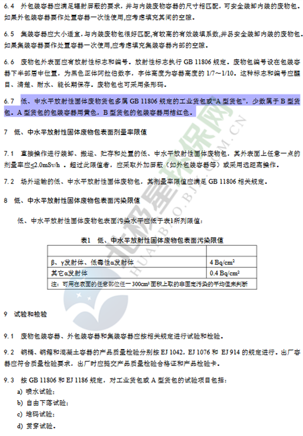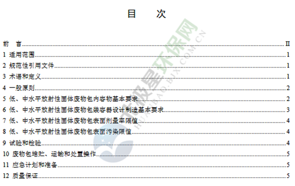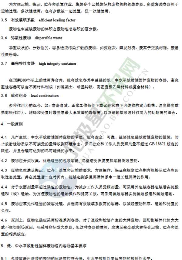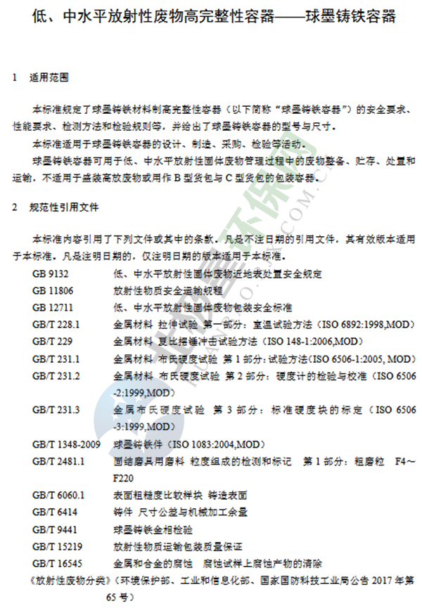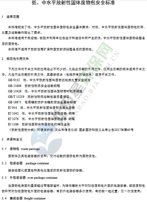 為貫徹《中華人民共和國環(huán)境保護法》《中華人民共和國放射性污染防治法》《中華人民共和國核安全法》,保護環(huán)境,保障人體健康,規(guī)范低、中水平放射性固體廢物安全管理,制定本標準。本標準規(guī)定了低、中水平放射性固體廢物包安全基本要求,包括低、中水平放射性固體包裝容器、外包裝(輻射屏蔽)容器和集裝容器的安全基本要求。