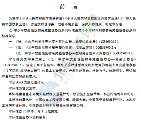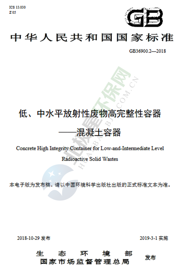 上述標準自2019年3月1日起實施,自實施之日起,《低、中水平放射性固體廢物包安全標準》(GB 12711-1991)廢止。