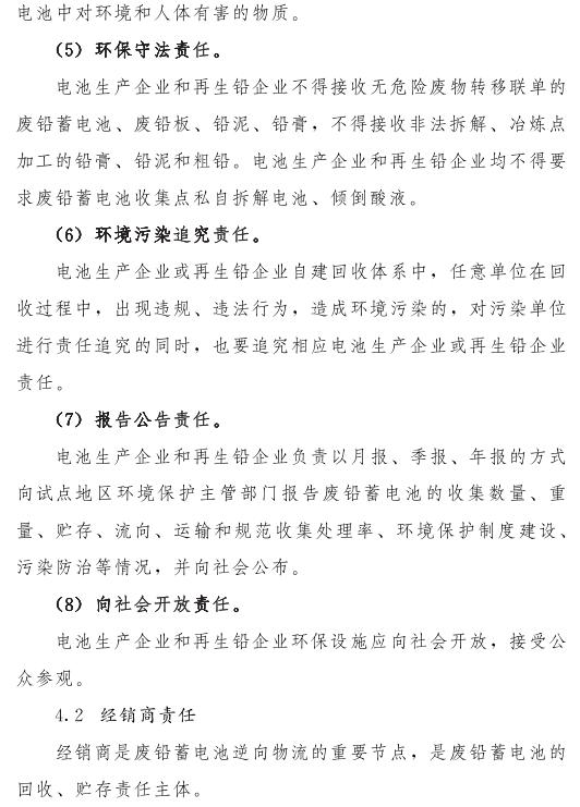 推動(dòng)落實(shí)生產(chǎn)者責(zé)任延伸制度,由鉛蓄電池生產(chǎn)企業(yè)依托自有銷售渠道建立廢鉛蓄電池逆向物流回收體系,持危險(xiǎn)廢物經(jīng)營(yíng)許可證的再生鉛企業(yè)可通過(guò)自主回收、聯(lián)合回收或委托回收等方式建立回收體系。鼓勵(lì)生產(chǎn)企業(yè)和持證企業(yè)進(jìn)行信息溝通和密切合作,以市場(chǎng)為導(dǎo)向,建立穩(wěn)定的商業(yè)交易模式,并采取以舊換新等措施,不斷提高收集處理率。各回收體系收集的廢鉛蓄電池最終須交由具有危險(xiǎn)廢物經(jīng)營(yíng)許可證的再生鉛企業(yè)利用處置。制定 《廢鉛蓄電池規(guī)范化管理指南》,明確回收體系中各環(huán)節(jié)、各責(zé)任主體責(zé)任及廢鉛蓄電池管理規(guī)范。參與廢鉛蓄電池回收的各責(zé)任主體須嚴(yán)格遵守 《廢鉛蓄電池規(guī)范化管理指南》的各項(xiàng)規(guī)定。
