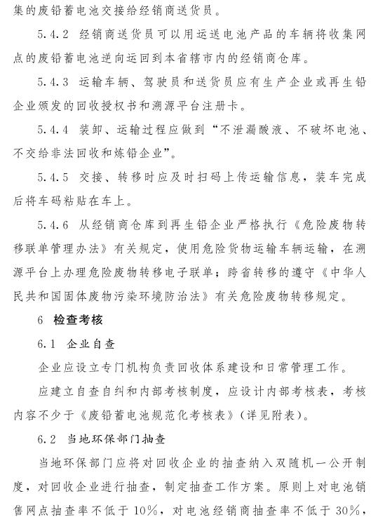 在試點(diǎn)市范圍內(nèi),廢鉛蓄電池在收集網(wǎng)點(diǎn)和經(jīng)銷商倉(cāng)庫(kù)之間轉(zhuǎn)移,可使用鉛蓄電池貨物運(yùn)輸車輛轉(zhuǎn)運(yùn),廢鉛蓄電池自經(jīng)銷商轉(zhuǎn)運(yùn)至持危險(xiǎn)廢物許可證的再生鉛企業(yè)、工業(yè)企業(yè)產(chǎn)生的廢鉛蓄電池集中轉(zhuǎn)運(yùn)的,按照危險(xiǎn)廢物進(jìn)行管理,運(yùn)行危險(xiǎn)廢物轉(zhuǎn)移聯(lián)單,遵守危險(xiǎn)貨物運(yùn)輸管理有關(guān)規(guī)定??缡∞D(zhuǎn)移廢鉛蓄電池的,應(yīng)當(dāng)經(jīng)移出地和移入地省級(jí)環(huán)保部門批準(zhǔn)。