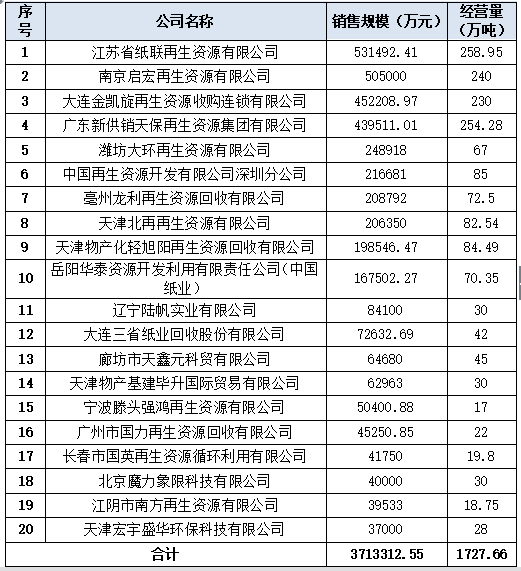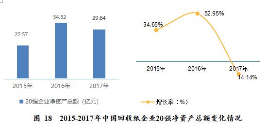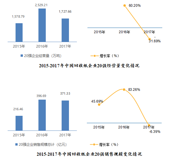 (一)2017年中國回收紙企業(yè)二十強(qiáng)的銷售規(guī)模371.33億元(2015年為216.46億元,2016年為396.69億元),較2016年同比降低了6.39%;經(jīng)營總量1727.66萬噸,較2016年的2529.21萬噸減少了約800萬噸,下降31.6%;凈資產(chǎn)總額為29.64億元,較2016年的34.52億元同比降低了14.14%,較2015年的22.57億元也有所下降。造成這種現(xiàn)象的主要原因是:一是經(jīng)營企業(yè)對于2017年的回收紙價(jià)格波動(dòng)采取防御政策,減少了經(jīng)營量;二是受國家環(huán)保政策不斷收緊、環(huán)保督察日趨嚴(yán)格、廢紙進(jìn)口管控政策趨嚴(yán)等因素影響,部分回收紙打包廠被迫關(guān)閉,減少了廢紙回收量;三是與《2016中國回收紙行業(yè)發(fā)展報(bào)告》相比,部分企業(yè)未進(jìn)行申報(bào),對銷售規(guī)??偤彤a(chǎn)生一定影響。