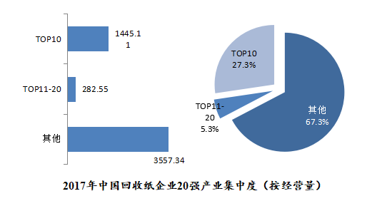 從回收紙行業(yè)二十強(qiáng)集中度看,2017年中國回收紙回收總量為5460萬噸,二十強(qiáng)企業(yè)經(jīng)營總量為1727.66萬噸,占全國總量31.6%;前10強(qiáng)企業(yè)經(jīng)營總量為1445.11萬噸,占前二十強(qiáng)總量的83.6%,占全國總量的26.5%,產(chǎn)業(yè)集中度較高;且有7家企業(yè)連續(xù)兩年進(jìn)入前10強(qiáng),帶領(lǐng)行業(yè)發(fā)展的影響力不斷增強(qiáng)。近年受到國家環(huán)保監(jiān)督和進(jìn)口管控等因素影響,2016年二十強(qiáng)上榜的3家企業(yè)在回收、生產(chǎn)、銷售等方面受影響較大,未能在2017年保持穩(wěn)定發(fā)展,進(jìn)入前二十強(qiáng)排名,導(dǎo)致2017年的產(chǎn)業(yè)集中度相較于2016年有所下降。