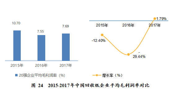 (二)2017年,中國回收紙二十強(qiáng)企業(yè)平均綜合毛利率為7.69%,較2016年的7.55%上升了0.14個(gè)百分點(diǎn),同比增長1.79%;但仍低于2015年的10.70%,說明中國回收紙企業(yè)的競爭力和盈利能力與上一年基本持平,受行業(yè)整體發(fā)展趨勢影響,提升緩慢。