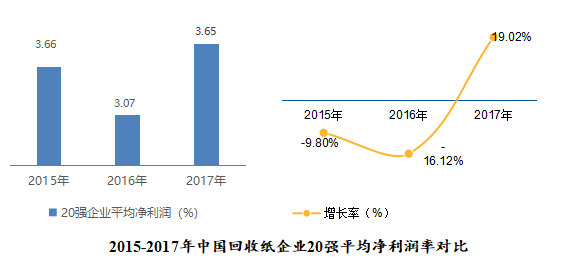 (三)2017年,中國回收紙二十強(qiáng)企業(yè)平均凈利率為3.65%,較2016年的3.07%上升了0.58個(gè)百分點(diǎn),同比增長了19.02%,但是略低于2015年3.66%。結(jié)合前二十強(qiáng)企業(yè)整體經(jīng)營情況,在2017年中國回收紙企業(yè)銷售收入總額降低的情況下,平均凈利率和平均綜合毛利率保持相對穩(wěn)定狀態(tài),說明總體企業(yè)盈利能力有所提升,反映出兩個(gè)行業(yè)發(fā)展趨向,一是回收紙企業(yè)發(fā)展的內(nèi)生動(dòng)力開始加強(qiáng);二是行業(yè)整個(gè)生產(chǎn)體系的內(nèi)需拉動(dòng)開始復(fù)蘇。