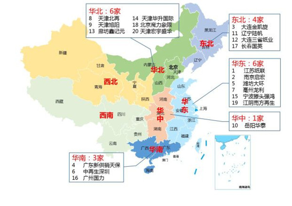 (一)從二十強(qiáng)企業(yè)的數(shù)量區(qū)域布局看,2017年中國回收紙二十強(qiáng)企業(yè)主要分布在華東和華北地區(qū),其中,華東、華北地區(qū)各有6家企業(yè)入圍前二十強(qiáng),且華東沿海地區(qū)的企業(yè)在銷售收入指標(biāo)排名都比較靠前;另外,東北地區(qū)4家,華南地區(qū)3家,華中地區(qū)1家。這種分布特點(diǎn)與經(jīng)營量100噸/天以上單體回收紙打包廠分布趨勢相一致,說明前二十強(qiáng)企業(yè)均重視經(jīng)營較大規(guī)模的回收紙打包廠,并由一定數(shù)量的大型回收紙打包廠作為業(yè)務(wù)支撐,由傳統(tǒng)回收向精細(xì)化方向發(fā)展,結(jié)構(gòu)調(diào)整、優(yōu)化升級正在加快進(jìn)行。