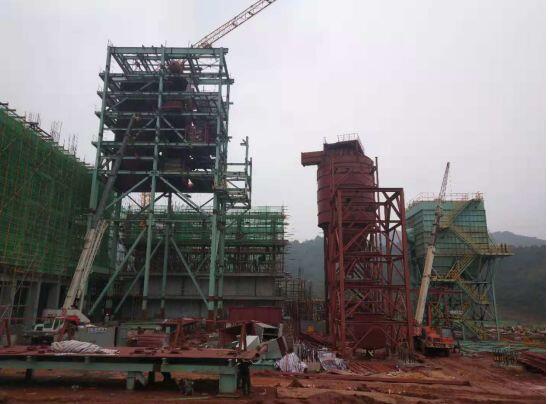 2、煙氣處理:收塵器頂部平臺組拼完,電動葫蘆吊架組拼安裝就位;反應塔直筒焊接,頂頂部電動葫蘆吊架吊裝就位;消石灰鋼構(gòu)拼裝完,筒體安裝,平臺鋼構(gòu)安裝;
