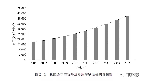 據(jù)國家統(tǒng)計(jì)局統(tǒng)計(jì),截至2015年年底,我國城鎮(zhèn)化率已經(jīng)達(dá)到56.1%。且目前正以年均1個(gè)百分點(diǎn)的速度增長。2015年,全國市容環(huán)衛(wèi)專用車輛設(shè)備共42702臺,同比增加3789臺,如圖2-1所示。