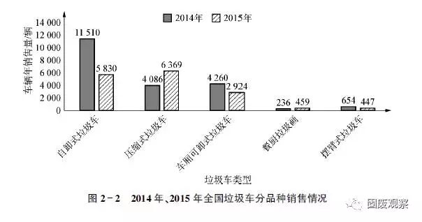 2015年我國垃圾車共完成銷售16386輛,同比下降24.03%。細(xì)分品種, 2015年壓縮式垃圾車?yán)塾?jì)銷量超過6300輛,同比增長55%以上,占2015年全國垃圾車總銷量超過38%,同比提升19%;自卸式垃圾車大幅下降,幅度超過49%,市場份額的下降超過17%;餐廚垃圾車實(shí)現(xiàn)快速增長,銷售459輛,同比增長194.23%,市場份額2.80%,同比提升2.08%;擺臂式垃圾車447輛,同比降低31.65%,市場份額2.73%。