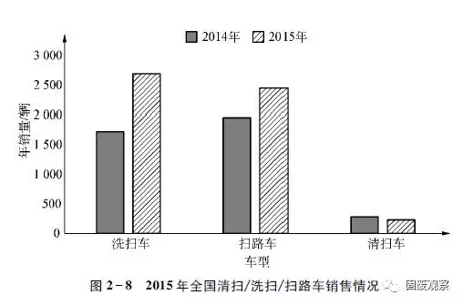 2015年,我國合計(jì)完成清掃車、洗掃車、掃路車銷售5386輛,同比增長36.01%。細(xì)分市場,洗掃車和掃路車?yán)塾?jì)銷量同比均實(shí)現(xiàn)增長,分別達(dá)到2700輛和2459輛,同比增幅分別在56%和25%以上,在2015年全國清掃/洗掃/掃路車總銷量中的占有率分別在50%和45%以上,同比分別增長6%和下降3%以上。