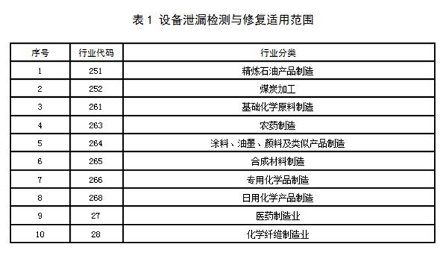 本規(guī)范規(guī)定了設(shè)備泄漏檢測與修復的實施范圍、技術(shù)方法等要求。本規(guī)范適用于本市表 1中所列行業(yè)企業(yè)含涉揮發(fā)性有機物物料設(shè)備的泄漏排放管理。