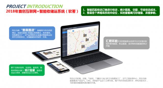 國家從2008年開始開始關(guān)注畜禽處理,2017年已經(jīng)開始形成規(guī)?;?。而匯君環(huán)能同時也從去年開始著手規(guī)劃整縣(市)資源化的處理,利用匯君模式,根據(jù)當(dāng)?shù)氐膶嶋H情況,合理規(guī)劃沼氣工程中心站,另外以村鎮(zhèn)為單位、以公里半徑為單位、以養(yǎng)殖規(guī)模為單位,建立有機肥加工廠,采用智能化收儲運平臺,有效利用地方的政策,配合消納政策,實現(xiàn)全方位畜禽糞污資源化智能處理。