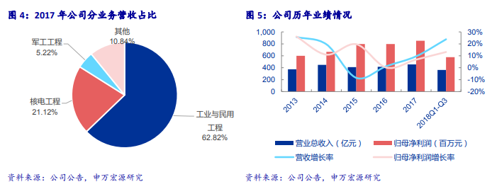 核電建設(shè)行業(yè)絕對龍頭,業(yè)績穩(wěn)健,積極擴(kuò)張民用與工業(yè)領(lǐng)域。公司是中國核建集團(tuán)旗下核電工程商,實(shí)際控制人為國資委。截至目前公司承建我國絕大多數(shù)核電站的核島工程,系我國核電建設(shè)領(lǐng)域領(lǐng)軍企業(yè),在國內(nèi)核電工程市場長期占據(jù)絕對主導(dǎo)地位。近年來公司依托技術(shù)優(yōu)勢,積極拓展工業(yè)與民用工程,2017 年工業(yè)與民用業(yè)務(wù)貢獻(xiàn) 55.96%的毛利,較 2011 年增長 16.11 個百分點(diǎn)。公司整體業(yè)績穩(wěn)健,2012-2017 年歸母凈利潤復(fù)合增速達(dá) 12.38%。2016 年公司順利登陸 A 股,募資加碼建設(shè)核電工程。截至 2017 年底,公司在國內(nèi)已建成核電機(jī)組 39 臺,在建 19 臺;在國外已建成核電機(jī)組 4 臺,在建 2 臺。