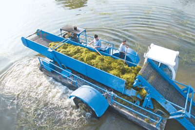 圖為5月10日,工人正在清理淄河水草。崔立來攝