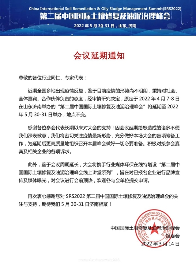 SRS2022延期通知|第二屆中國國際土壤修復(fù)及油泥治理峰會(huì)將延期至2022年5月30-31日舉行