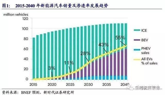 新能源汽車發(fā)展空間巨大,隨著新能源汽車性能提升以及痛點的改善,新能源汽車帶來的沖擊越來越大,滲透率隨之提升。 根據(jù)BNEF預測,到2025年全球新能源汽車的銷量將達到1100萬輛,滲透率達到11%,同年燃油汽車銷量將達到拐點,步入下行趨勢;到2030年全球銷量將繼續(xù)攀升至3000萬輛,滲透率達到28...