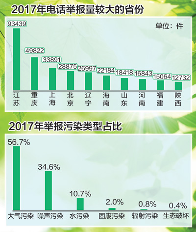 環(huán)境保護(hù)部1月23日發(fā)布通報(bào):2017年,全國(guó)環(huán)保舉報(bào)管理平臺(tái)共接到環(huán)保舉報(bào)61.89萬(wàn)件,其中“12369”環(huán)保舉報(bào)熱線電話41萬(wàn)件,約占66.2%,微信舉報(bào)近13萬(wàn)件,約占20.9%,網(wǎng)上舉報(bào)79885件,約占12.9%。目前已辦結(jié)近59萬(wàn)件,其余2.9萬(wàn)件正在辦理中,環(huán)保舉報(bào)辦結(jié)率達(dá)95%。電...