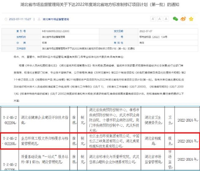 近日,湖北省市場(chǎng)監(jiān)督管理局印發(fā)關(guān)于下達(dá)2022年度湖北省地方標(biāo)準(zhǔn)制修訂項(xiàng)目計(jì)劃(第一批)的通知,長(zhǎng)江環(huán)保集團(tuán)牽頭主編的《生態(tài)環(huán)保工程文件歸檔要求與檔案管理規(guī)范》成功入選2022年湖北省地方標(biāo)準(zhǔn)項(xiàng)目立項(xiàng)計(jì)劃(第一批),這是公司成立以來(lái)首次牽頭主編的省級(jí)地方標(biāo)準(zhǔn)?!逗笔∈袌?chǎng)監(jiān)督管理局關(guān)于下達(dá)2022年...