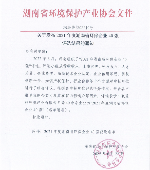 深化改革初見(jiàn)效 助力企業(yè)新發(fā)展 || 中鐵環(huán)境獲評(píng)湖南省環(huán)保企業(yè)40強(qiáng)