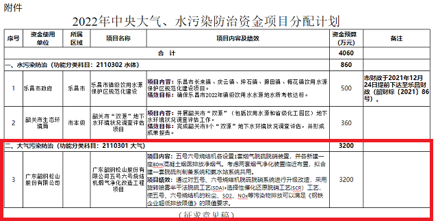 廣東韶關(guān)擬將2022年中央大氣污染防治資金,全部用于韶鋼燒結(jié)機煙氣凈化改造