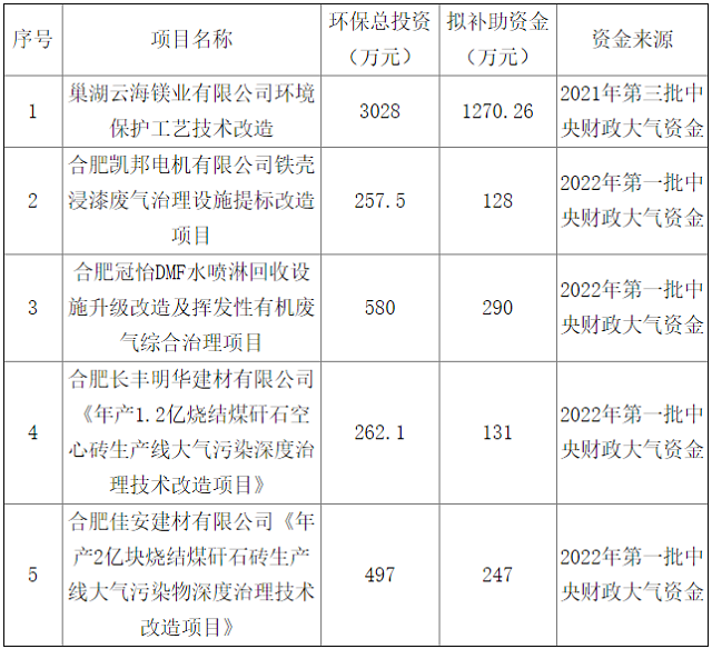 合肥市2021年度第三批、2022年第一批中央財政大氣污染防治資金分配公示(第二批次)