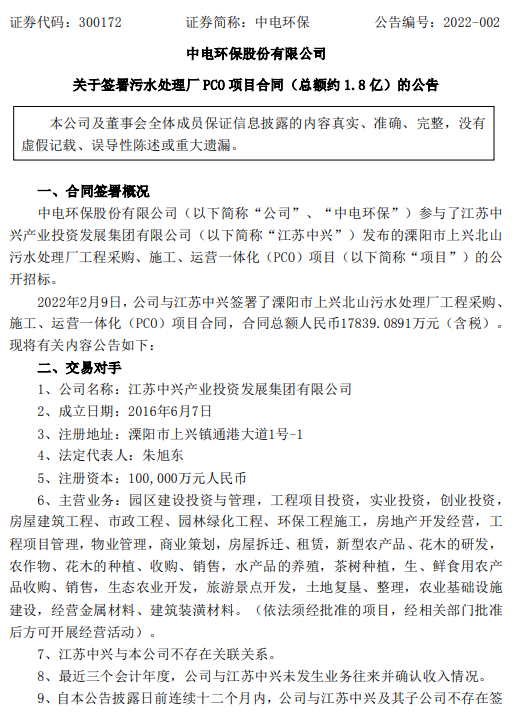 2022年2月10日,中電環(huán)保發(fā)布公告稱公司中標并簽署了溧陽市上興北山污水處理廠工程采購、施工、運營一體化(PCO)項目合同,合同總額約人民幣1.8億元。(詳情見:中電環(huán)保:以近1.8億中標溧陽市上興北山污水處理廠工程采購、施工、運營一體化(PCO)項目) 項目主要建設(shè)內(nèi)容:處理廠廠內(nèi),包括:污水處...