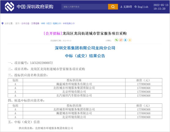 兩標(biāo)20億元,北控城市服務(wù)“城市大管家”之路越走越寬廣。深圳政府采購(gòu)網(wǎng)消息,2022年5月13日,深圳市龍崗區(qū)平湖街道城市管家服務(wù)項(xiàng)目公布中標(biāo)結(jié)果,在與北京環(huán)境有限公司、瀚藍(lán)城市環(huán)境服務(wù)有限公司、北汽福田汽車股份有限公司的同場(chǎng)較量中,北控城市環(huán)境服務(wù)集團(tuán)有限公司成功勝出。成交信息如下:供應(yīng)商名稱:北...