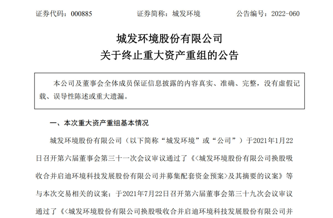 據(jù)公告顯示,終止本次重大資產重組的原因是城發(fā)環(huán)境自籌劃本次重大資產重組事項以來,嚴格按照相關法律法規(guī)的要求,與交易對方及其他相關雙方持續(xù)進行磋商與研討,并根據(jù)磋商結果積極推進相關盡職調查、審計、信息披露、內部決策等工作。鑒于本次重大重組方案論證歷時較長,相關市場環(huán)境較本次交易籌劃之初發(fā)生較大變化。經(jīng)...
