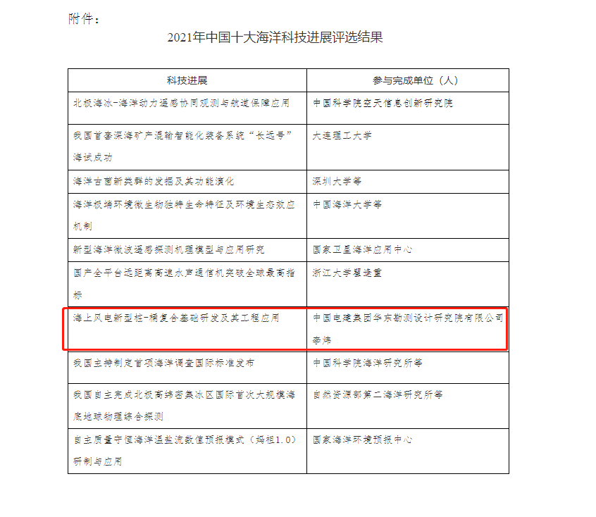 日前,華東院海上風(fēng)電“新型樁-桶復(fù)合基礎(chǔ)研發(fā)及其工程應(yīng)用”入選2021年度中國十大海洋科技進(jìn)展。這項(xiàng)由華東院發(fā)明并創(chuàng)新設(shè)計(jì)的核心技術(shù),不僅大幅提高了海上施工作業(yè)效率,也為破解海上風(fēng)電走向深遠(yuǎn)海、大機(jī)組過程中常規(guī)單樁基礎(chǔ)承載力不足等難題,提供可復(fù)制、可推廣、可借鑒的經(jīng)驗(yàn)與思路,...