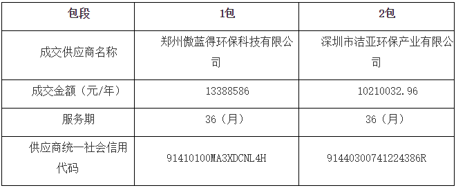 湖北省監(jiān)利縣城區(qū)環(huán)衛(wèi)作業(yè)市場(chǎng)化項(xiàng)目發(fā)布評(píng)標(biāo)結(jié)果公示,鄭州傲藍(lán)得環(huán)??萍加邢薰精@得1包,中標(biāo)金額1339萬(wàn)/年,服務(wù)期限36個(gè)月。 具體中標(biāo)信息如下: 附項(xiàng)目信息: 服務(wù)內(nèi)容:監(jiān)利城區(qū)清掃保潔、生活垃圾收集運(yùn)輸、公廁保潔維護(hù)、水域保潔、中轉(zhuǎn)站管理、牛皮癬清理。 第1包: (1)項(xiàng)目包編號(hào):1包 (2...