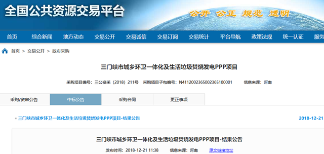 2018年12月21日,河南省三門峽市城鄉(xiāng)環(huán)衛(wèi)一體化及生活垃圾焚燒發(fā)電PPP項(xiàng)目發(fā)布結(jié)果公告,結(jié)果具體如下: 一標(biāo)段預(yù)中標(biāo)社會資本方: 單位名稱:北京環(huán)境有限公司(牽頭人)、北京中科仁和環(huán)??萍加邢薰?聯(lián)合體成員) 報(bào)價(jià)大寫:壹億零伍佰玖拾捌萬捌仟玖佰玖拾伍元叁角貳分每年 小寫:¥10598899...